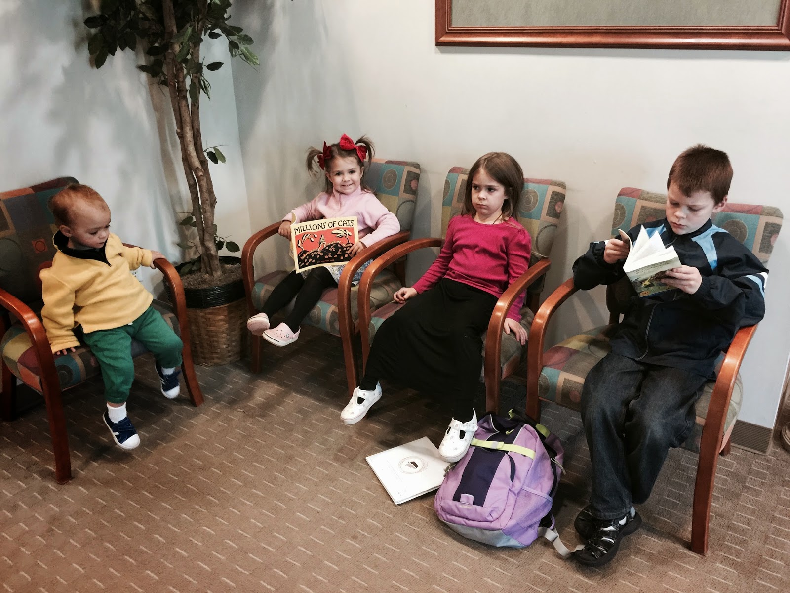 When you're a homeschooling mother and haven't yet reached that glorious and tantalizing place we've only heard of called Having a Child Old Enough to Babysit, then taking one child to an emergency dental visit means taking all the children along, and that means, of course, no school.