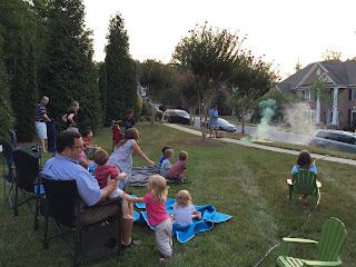 After a much-needed nap and Quiet Time, and fun family Gin Rummy game in the air-conditioned house, we headed over to some friends where four families were gathering for dinner--BBQ sandwiches, grilled chicken, macaroni and cheese, green salad, collard greens, watermelon, cupcakes, cookies--and fireworks.