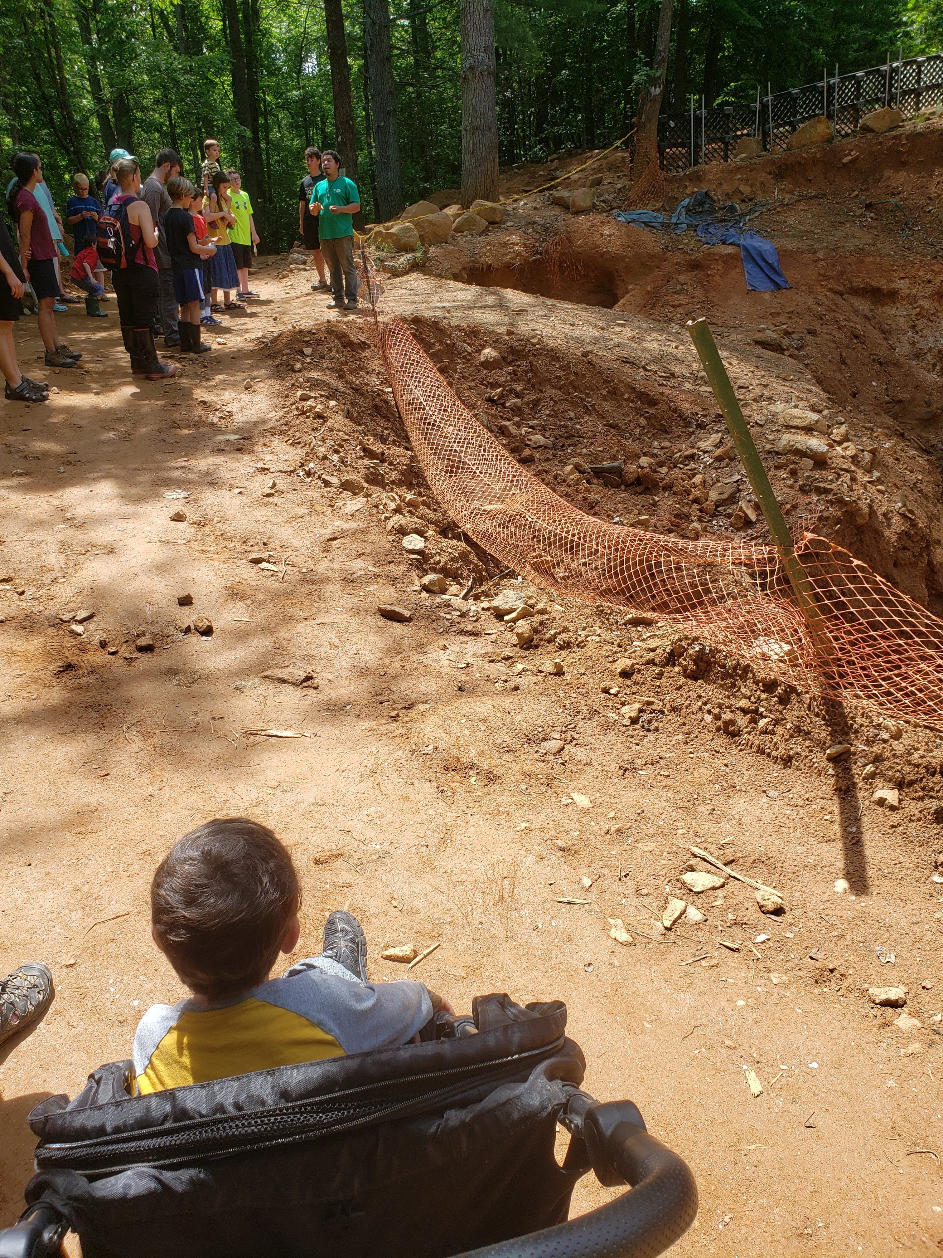 If you call ahead, like I did, and inquire if the trail through the mine and the woods is accessible for a jog stroller, you will be told yes. I'd like to clarify that that is a very loose "yes," and shouldn't be taken to mean actually yes. Only in a few stretches was the dirt hard packed and smooth like in the below picture. Much of the time, I was pushing the stroller uphill along a bath strewn with rocks that most of us would call boulders that were ranging from the size of my fist to the size of a football. A whole sea of those stones that I somehow had to push my stroller over. Finally at one point, I had to abandon the group and take Thomas in the stroller back. I'd advise taking along babies you can wear on your body or preschoolers who can walk (my kiddo almost four years old made it but not without his legs aching badly by the end).