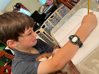 | Day one complete by 12:15! I taught math x3, spelling x1, phonics x1, grammar x1, handwriting x3, religion, and history. We will build up our stamina from here, but I am content. |