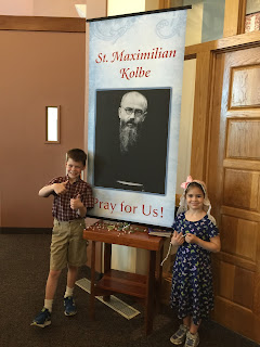 After mandatory potty stops all around, we entered the church and directed our group of 11 children ages 10 and under to pray for St. Maximilian Kolbe's intercession (see here). We had each child express an intention for the prayer.