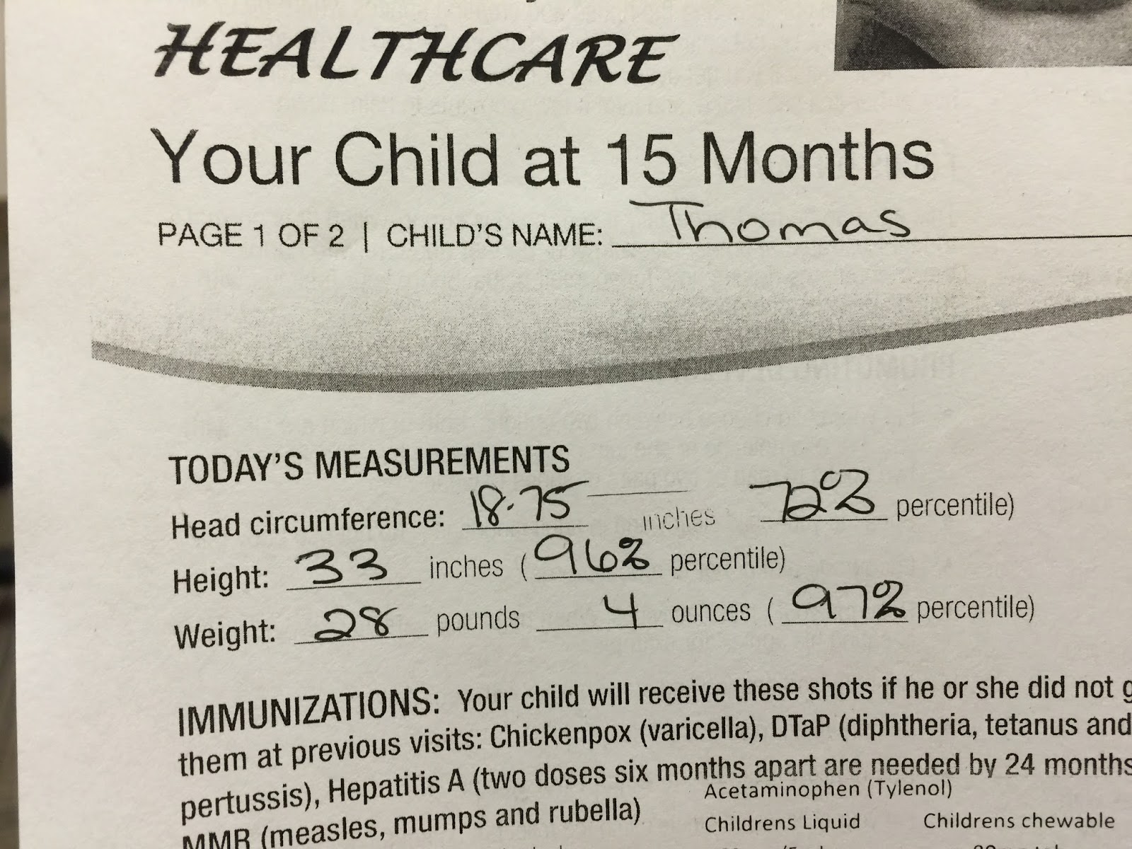 Thomas went to his 15-month well-baby check this week. He is a big baby, and my first baby ever to wear size 5 diapers, let alone at 15 months.